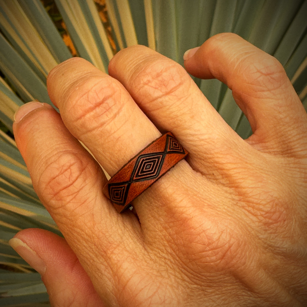 Ring is shown in the stain color of Rustic Brown to highlight the detail and tooling. This style is available in four different stains: Rustic Brown (as shown), Honey Suckle, Dark Brown, or Midnight Black.