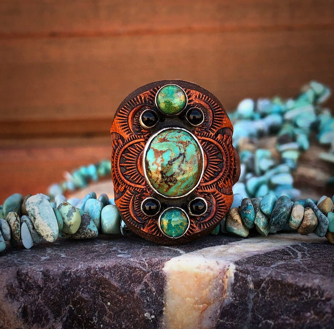 - Leather Ring with Boulder Kingman Turquoise and Onyx
